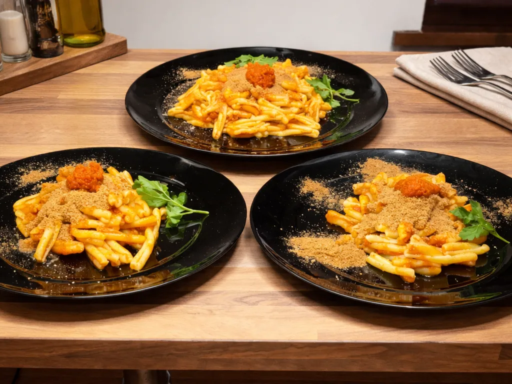Busiate vařte al dente, aby si zachovaly tvar a dobře zachytily pesto v jednotlivých záhybech. Pesto rosso přidávejte vždy až ke konci a nikdy ho nevařte, aby neztratilo svou barvu a chuť. Muddicu opečte zvlášť dozlatova a přidejte ji těsně před podáváním. Dodá jídlu kontrast a strukturu. Pokrm by měl působit lehce, ale chuťově výrazně, s jasně oddělenými složkami. Právě kombinace jemného pesta a křupavé strouhanky je pro tento pokrm typická.
